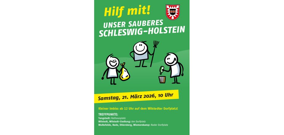 wie auch in den vergangenen Jahren findet wieder landesweit die Aktion „Unser sauberes Schleswig-Holstein“ statt, an dem auch wir uns beteiligen werden, um in der Gemeinde liegengelassenen Müll zu entsorgen.
